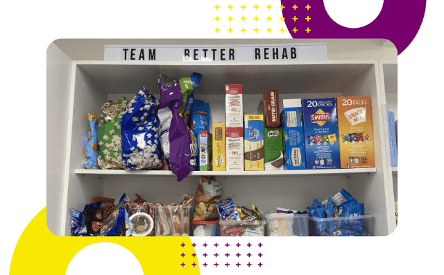 "I'm truly grateful for the snacks Better Rehab supplies, and our awesome office managers who keep us well stocked. It makes a difference to productivity when you have food, snacks, and drinks readily available to keep you going each day." 😊