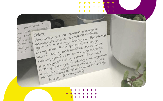 "I am eternally grateful for the support I have had from my clinical supervisor this year. Despite being in different offices, she has always made herself available when I need support and she has placed so much trust in me. This has allowed me to feel confident in my role and supporting my participants."