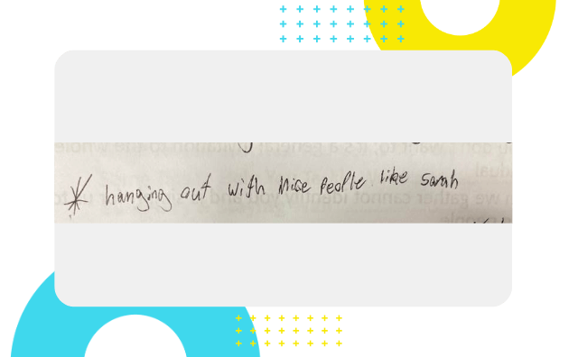 "A memorable moment for me was asking one of my participants to list all the things he was grateful for and he listed this: Hanging out with nice people like Sarah."
